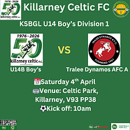 🙎♂️KSBGL U14 Boy’s Division 1🇳🇬U14B Boy’s 🆚 Tralee Dynamos AFC A📆Saturday 4th April⚽️Kick off...
