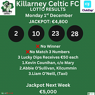 🇳🇬Jackpot €4,800 Monday 1st December 2025🇳🇬Killarney Celtic FC Lotto is the only source of fun...