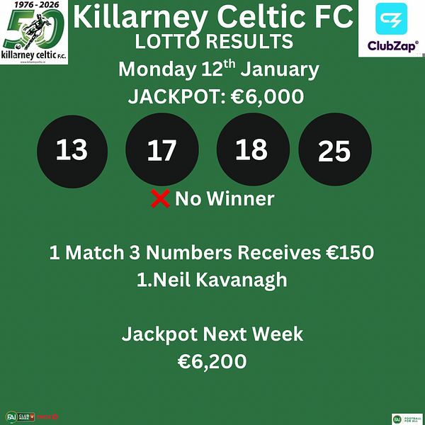 Killarney Celtic Lotto Monday 12th January 2026