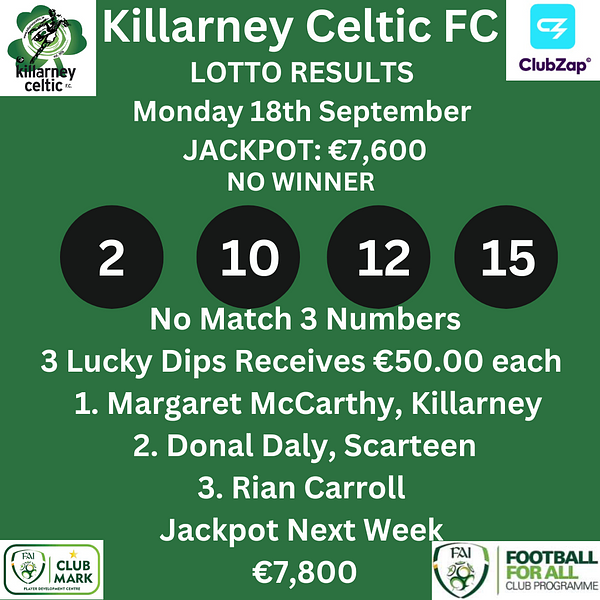 🇳🇬 Killarney Celtic Lotto Monday 18th September 2023