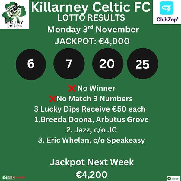 🇳🇬 Killarney Celtic Lotto Monday 3rd November 2025